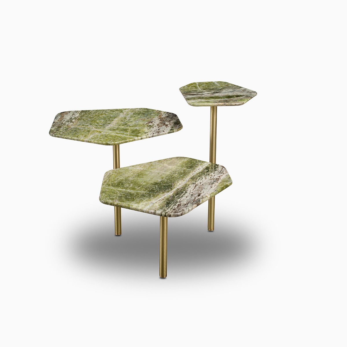 Tubular structure in satin brass. Marble top. MEASURES: L / W 72 P / D 85 H 55